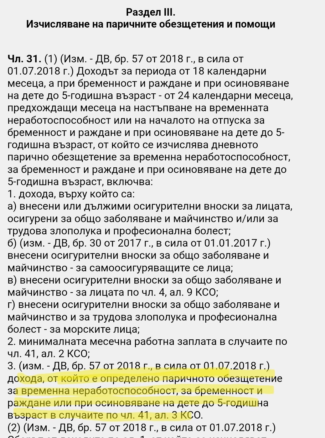 (3) (Изм. - ДВ, бр. 105 от 2006 г., в сила от 01.01.2007 г., изм. - ДВ, бр. 1 от 2014 г., в сила от 01.01.2014 г., изм. - ДВ, бр. 30 от 2018 г., в сила от 01.07.2018 г.) За дните, включени в периода по ал. 1, през които лицето е получавало парично обезщетение от общественото осигуряване за временна неработоспособност, за бременност и раждане или при осиновяване на дете до 5-годишна възраст, се взема предвид доходът, от който е определено паричното обезщетение.