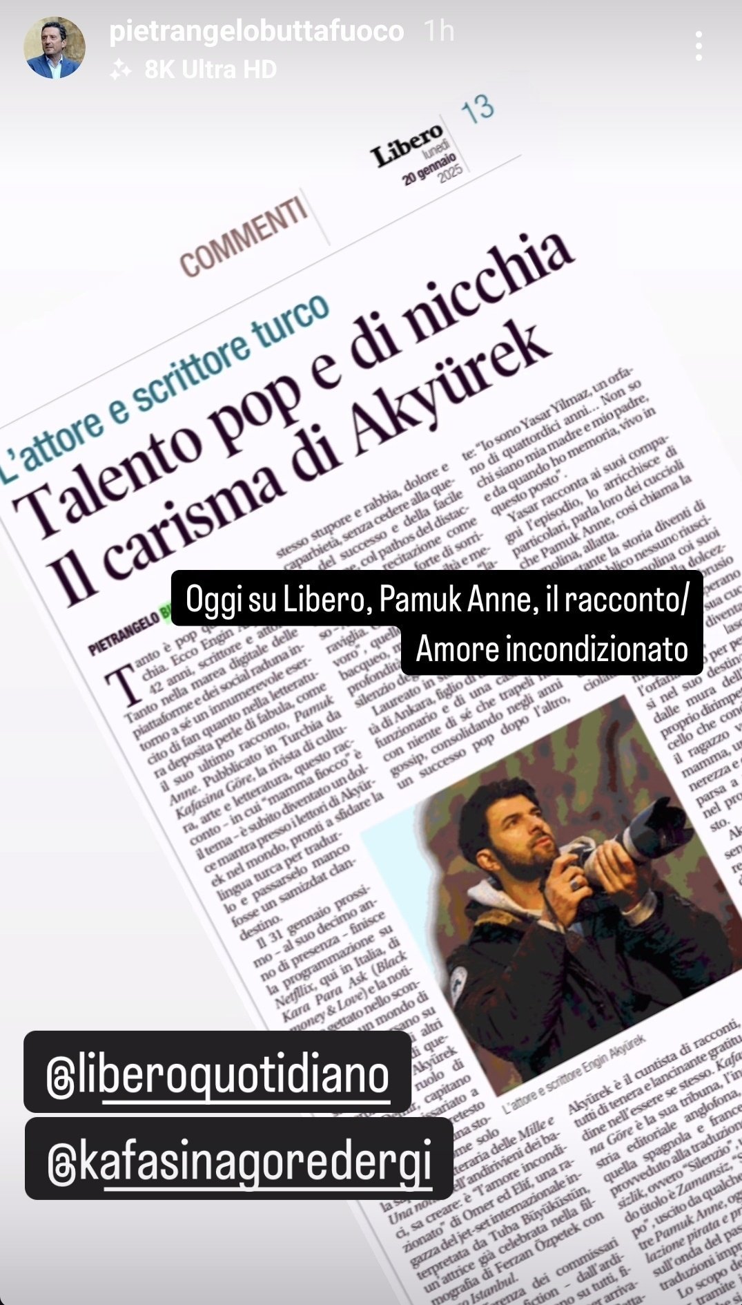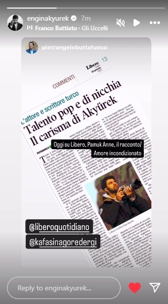 Eнгин преди малко в сторито си пусна тази снимка - репост на Пиетранджело Бутафуоко, президент на La Biennale. Той е написал статия озаглавена „Турски актьор и писател – харизмата на поп и нишовия талант( "нишов" означава "различен" и не иска да се хареса на всички. Това определение обаче не съдържа никакви твърдения относно цената или качеството) Акюрек“, описва актьорския и писателски талант на Акюрек. В своята колона във вестника г-н Пиетранджело обяснява идентичността на актьора като писател чрез новия разказ на Акюрек „Pamuk Anne“, публикуван в списание Kafasına Göre, като същевременно набляга на представянето му в сериала "Мръсни пари и любов", излъчван по Netflix. Снимка на статията за италианският всекидневник Libero Quotidiano: