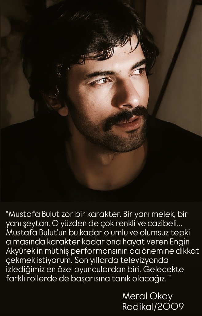 „Мустафа Булут е труден герой. Едната страна е ангел, другата страна е дявол. Ето защо той е толкова колоритен и очарователен... В това, че Мустафа Булут получава толкова много положителни и отрицателни реакции, е важно да се отбележи, че невероятното представяне на Енгин Акюрек, който му дава живот, е също толкова важно, колкото и героят. Искам да снимам. Той е един от най-специалните актьори, които сме гледали по телевизията през последните години. Ще станем свидетели на неговия успех в различни роли в бъдеще."