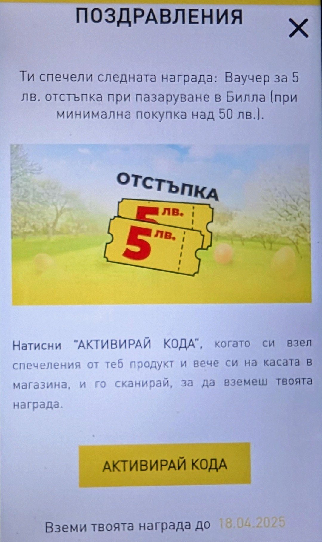 Подарявам ваучер за 5 лв. отстъпка при пазаруване в Билла при покупка над 50 лв., валиден до 18.04.2025 г. вкл.
