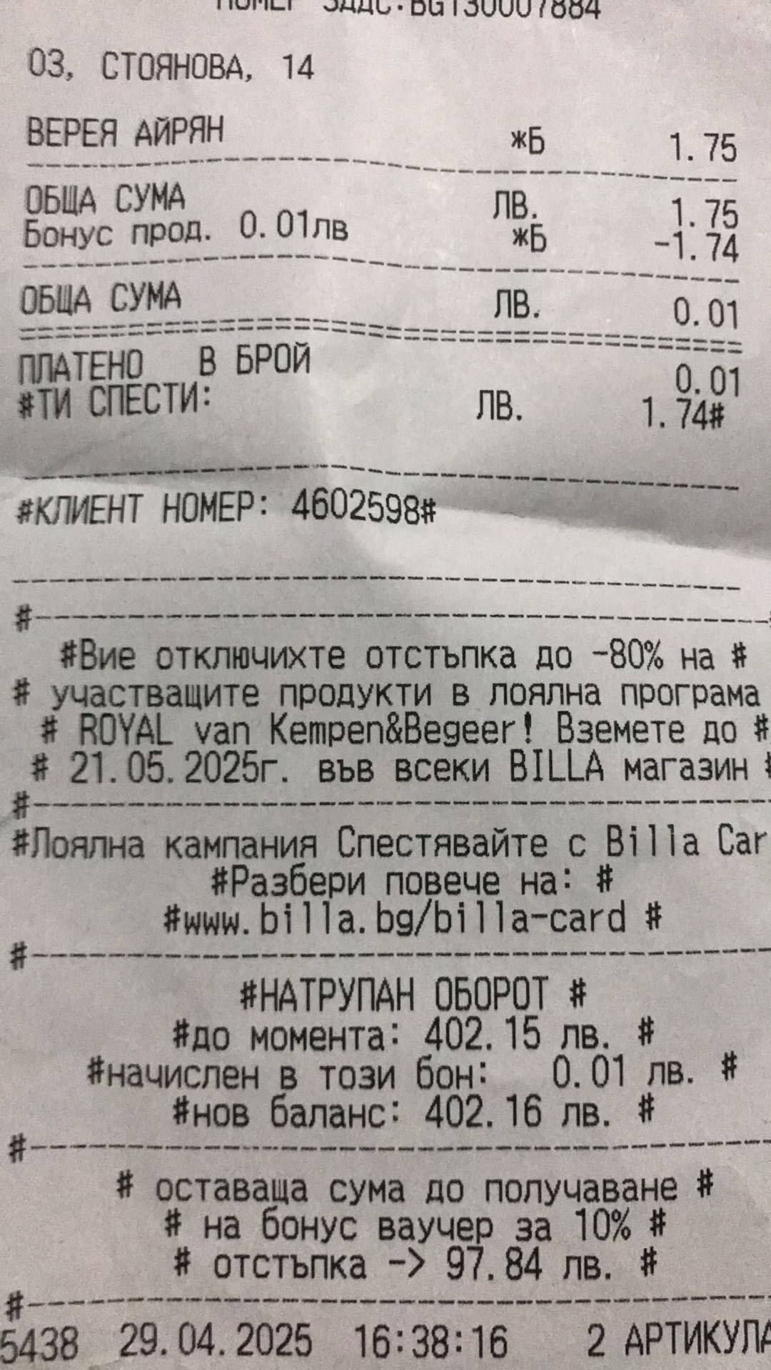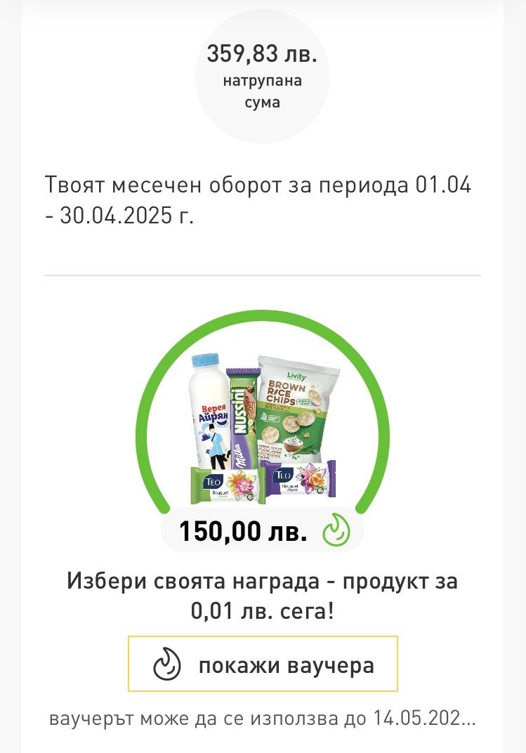 Отделно продукта за 1 стотинка не ми го зачете на същата сметка. Бях взел някакъв brown rice chips с вкус на ванилия, точно както беше според офертата от продукти за 1 ст., но на касата не ми го зачете. Към 2 лв е. Казаха ми, че било друг вид, но бях убеден, че беше точно този вид. Изрично погледнах преди да го взема. Според мен причината беше, че няма как да ми сложи 2 отстъпки на едно пазаруване. Завърших сметката, без да взема продукта за 1 стотинка. Платих и пак влязох навътре в магазина, взех друг продукт за 1 ст., - айран Верея, 480 мл, този път ми го зачете. Изобщо... цялата далавера от двата ми бонуса за натрупана сметка над 300 лв беше.... под 2 лв Grinning Егати келепира Grinning