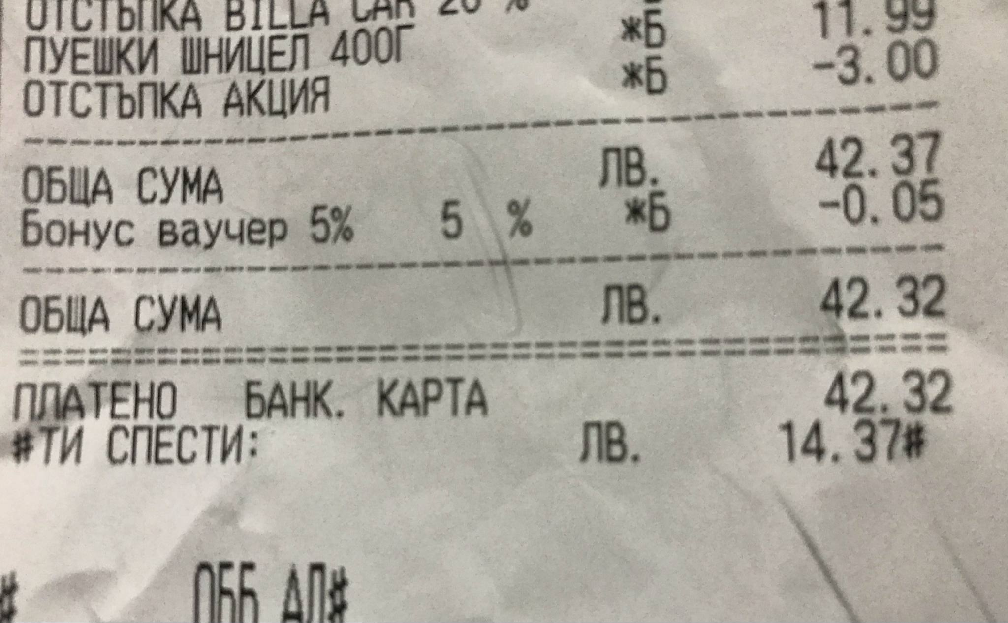 Точно така се оказа. И явно купих предимно намалени неща и то ми сметна само от ненамален продукт, общо имам 5 стотинки отстъпка от сметка 42 лв, хахахаха.  Това са ми 5-те %.