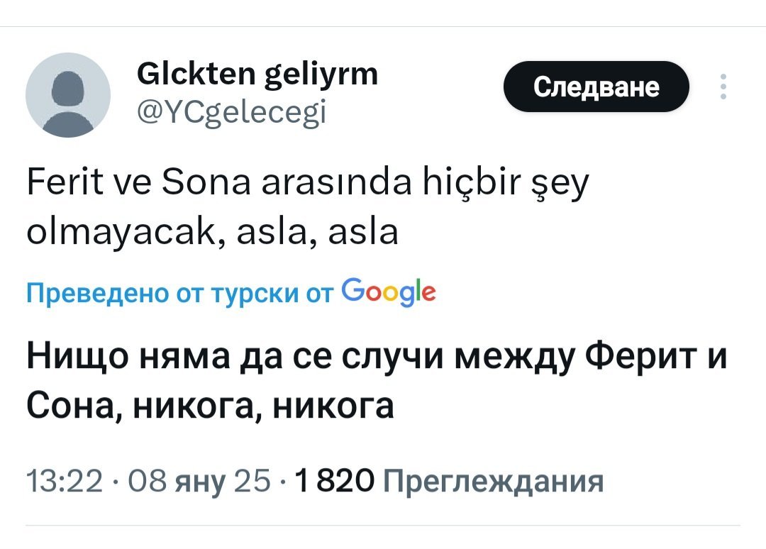 Може и да гледат в петък, за да видят какво точно се е случило между Феро и балдъзата. А и явно Сейран е успяла да върне Ферит в имението и се надявам да имат повече сцени заедно, че бактън вече от Абидин и майка му.