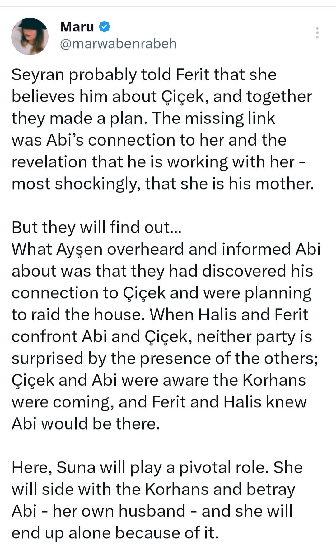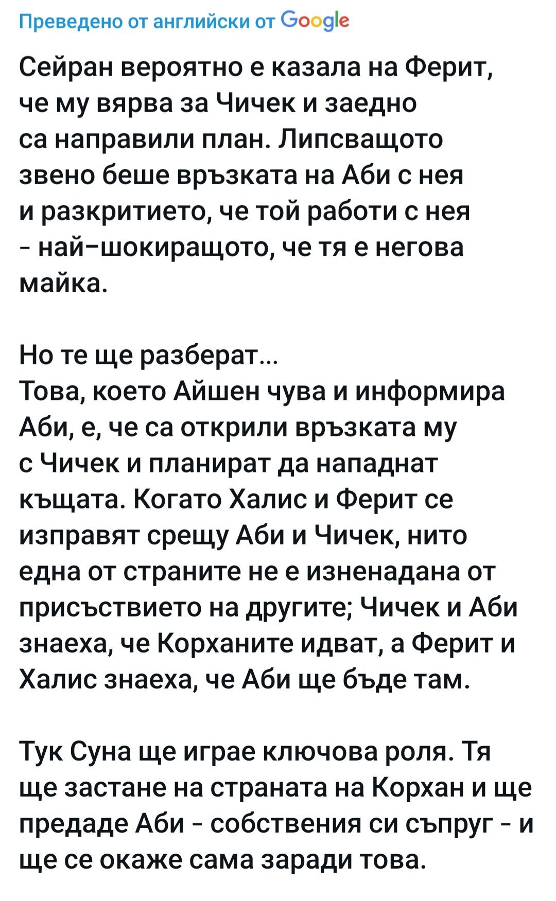 Хайде, пак "теории на конспирациите".Къде е Сейран?Заминала ли си е?Избягала ли е?Отвлечена ли е?Ами защо просто не предположим,че е отишла в болницата за поредния сеанс от лечението си без да споделя с някого и е излязла преди всички да се събудят?Суна е по пижама,което предполага,че все още са по леглата си.Есме е отишла в стаята на Сейран видяла е,че я няма и е надигнала паниката заедно с Кязъм.Май тук ще разбере Ферит за какво се притеснява Есме.