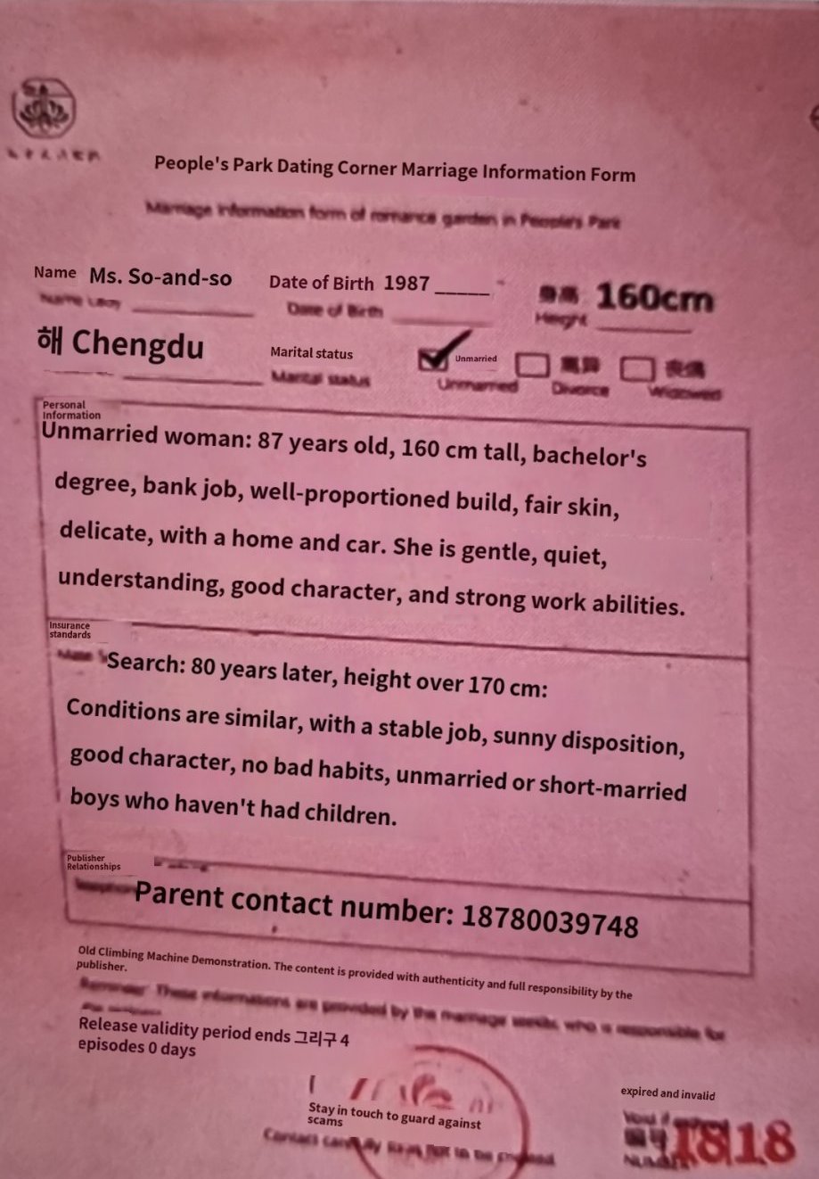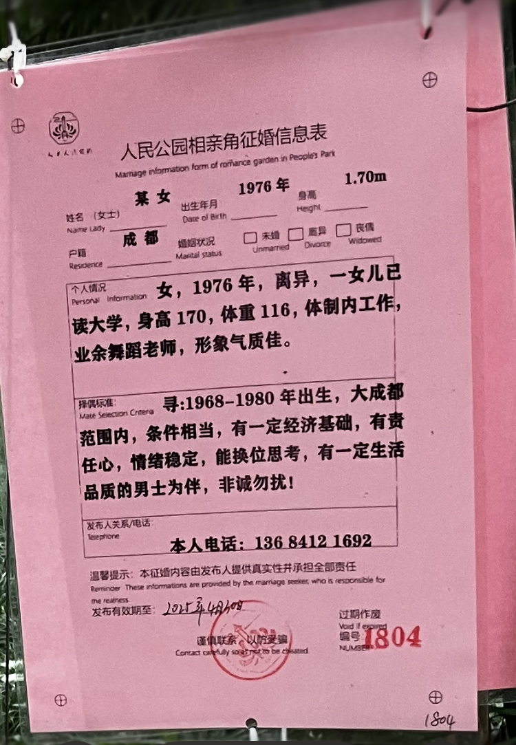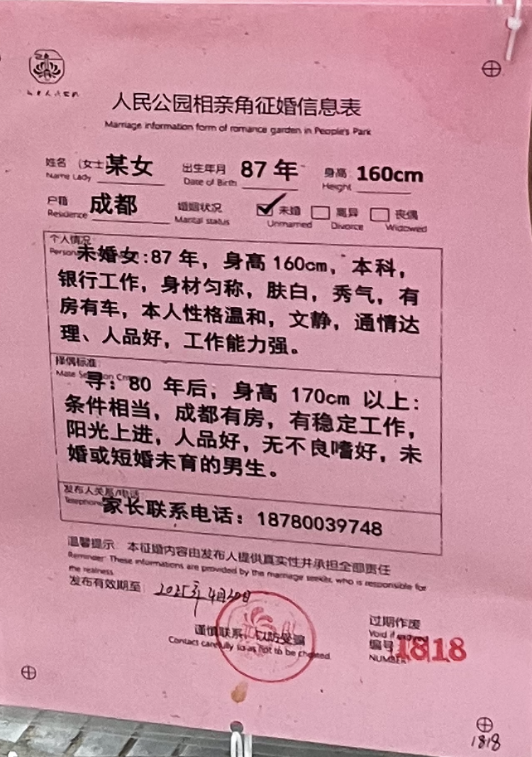 Prinx, аз съм гледала за такова място за обяви в Шанхай, ама наистина не ми ае вярваше, че съществуват. Обикновено отчаяни родители на “деца”, които не искат да се женят, слагат обява с всички данни - включително доходите, какво имущество имат. Ето две обяви, може да ги пуснете през гугъл за превод: