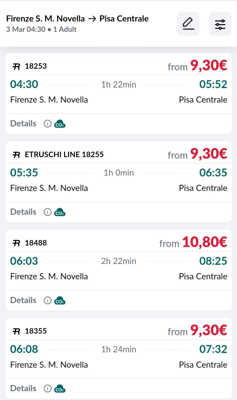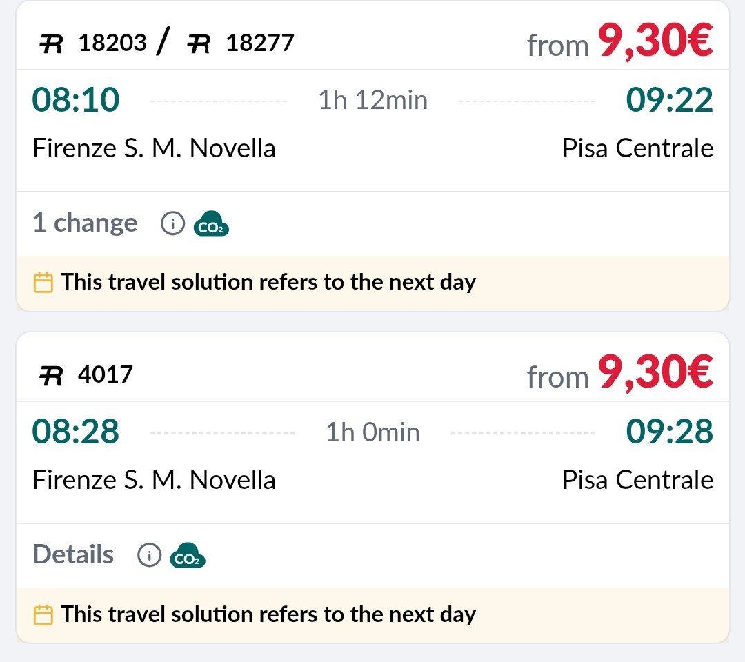 Пиза - Флоренция : регионален влак - не е нужно да се купува предварително, цената е фиксирана, резервация не е възможна.