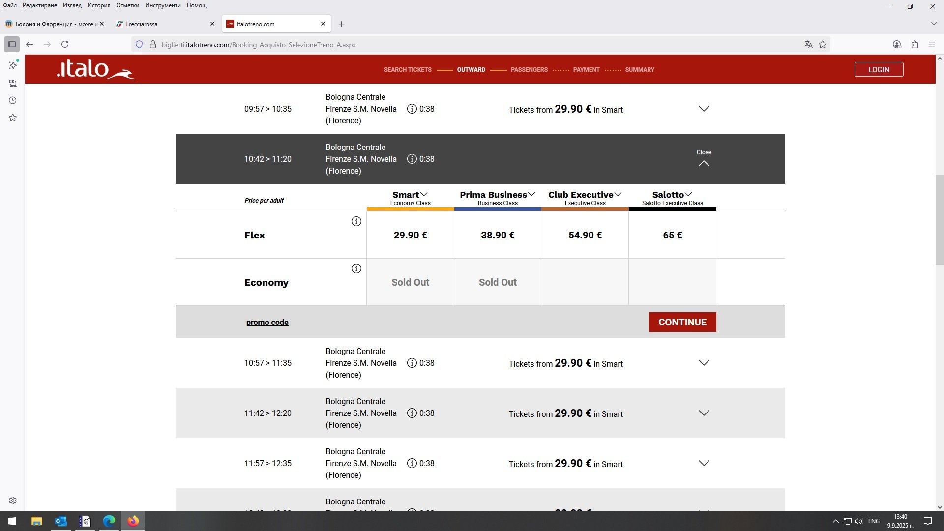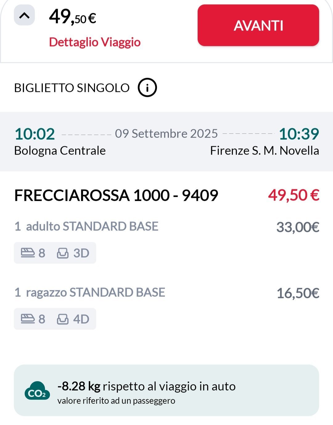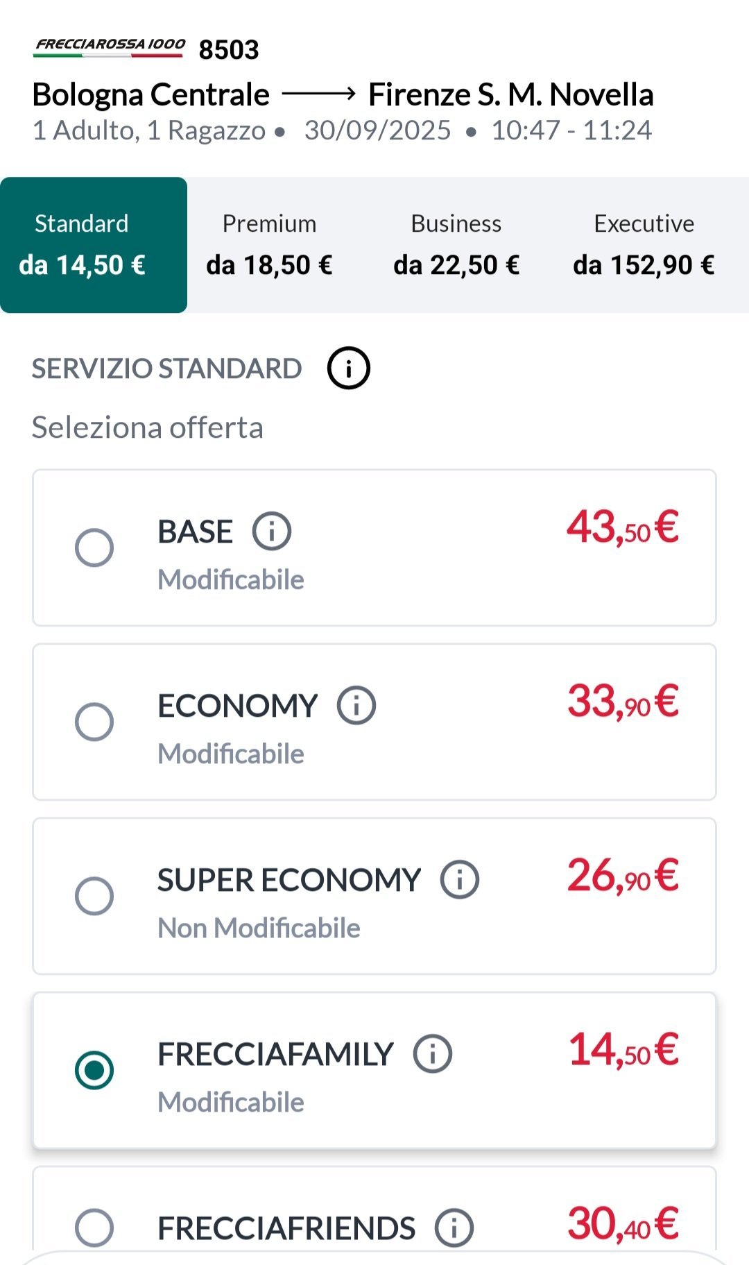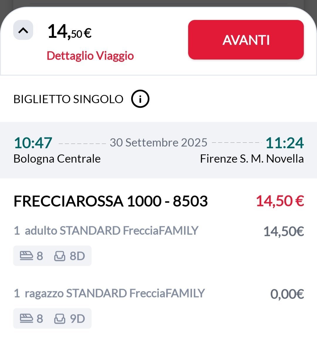 В Болоня видяхме високоскоростни влакове на две компании -  Frecciarossa (Trenitalia) и частните Italo (спират на последните коловози, в тунел под земята). Ползвахме до Флоренция първите, като успях да купя онлайн "семеен" билет (какъвто предлага и regina di cuori Simple Smile ) за мене и малкия (на 13 гг.), беше ни най-изгодната опция, но си спомням, че количествата бяха ограничени и го взех доста отрано.
