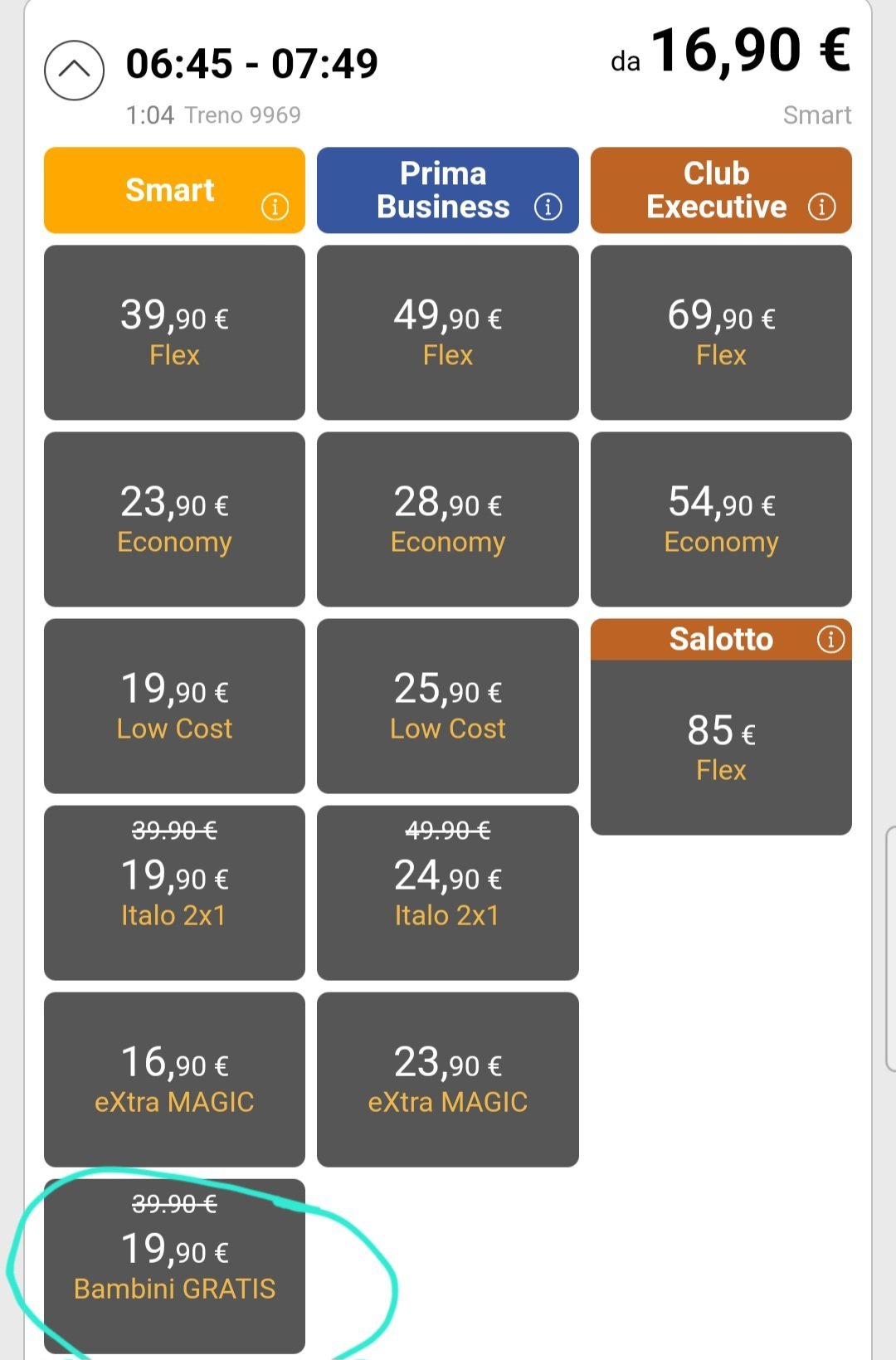 При Итало деца под 14г. пътуват безплатно с поне 1 възрастен (мин.2, макс 4 човека), като възрастният плаща 50% от тарифа флекс и само при smart класа.
