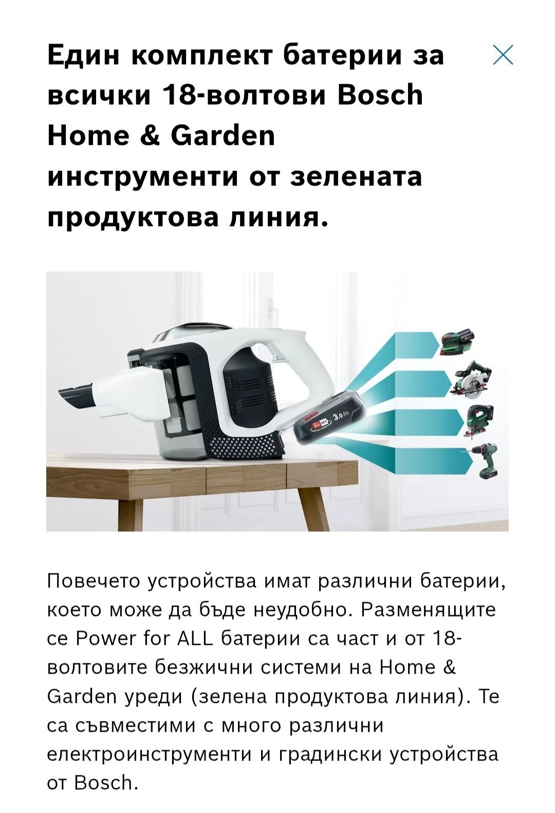 Ето още една причина да си купите Bosch - батериите им са съвместими с техните електроуреди от зелената им продуктова линия. Моята прахосмукачка беше с 2 батерии в комплект /което за мен беше решаващо при избора/+ станция за бързо зареждане, но дори да нямаше втора батерия, винаги мога да си купя.