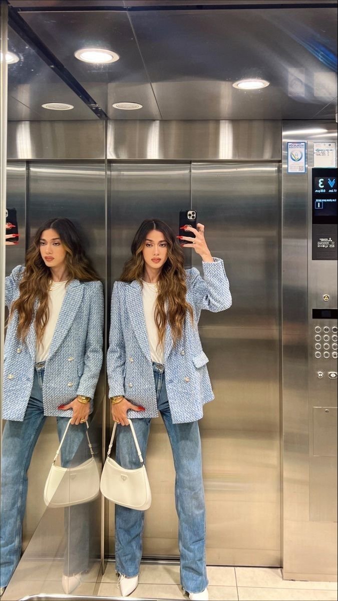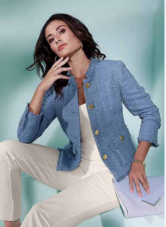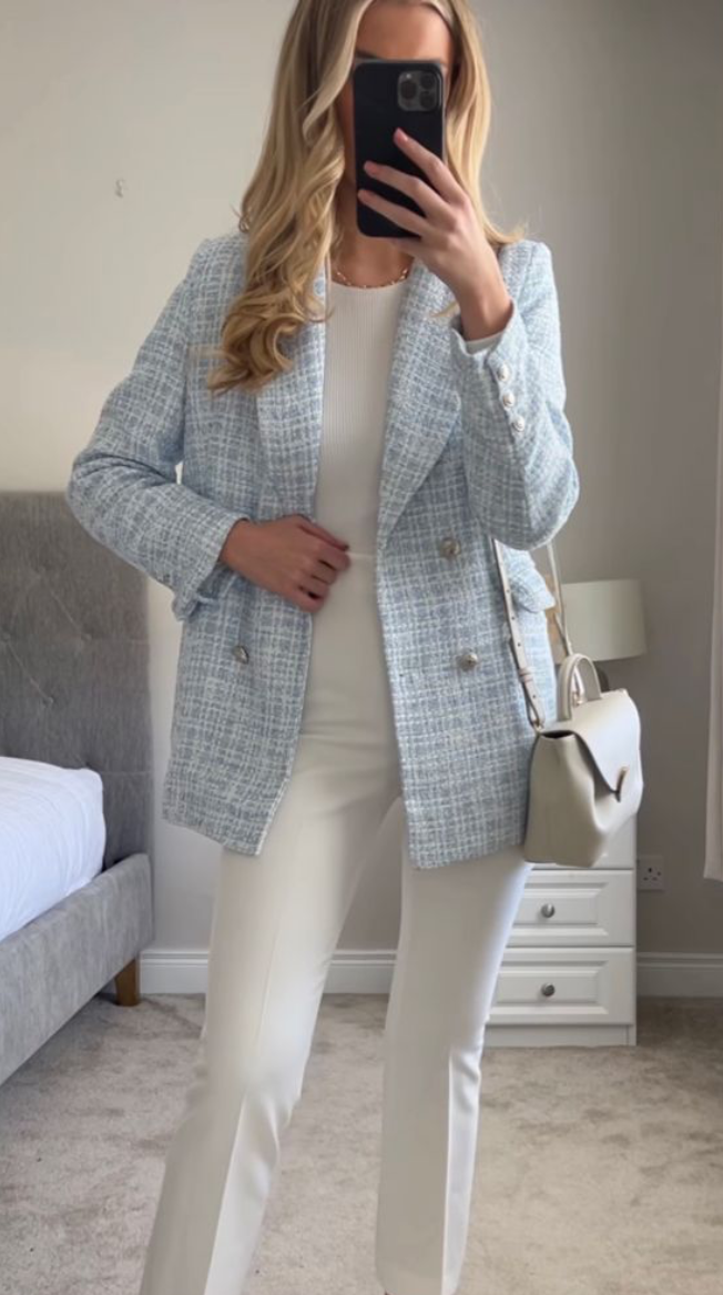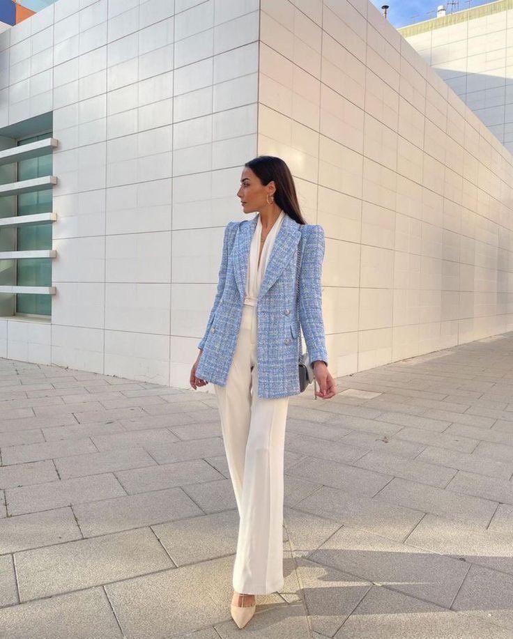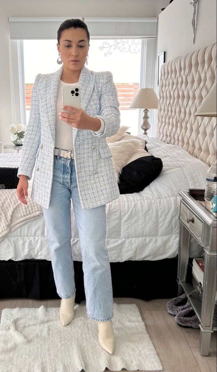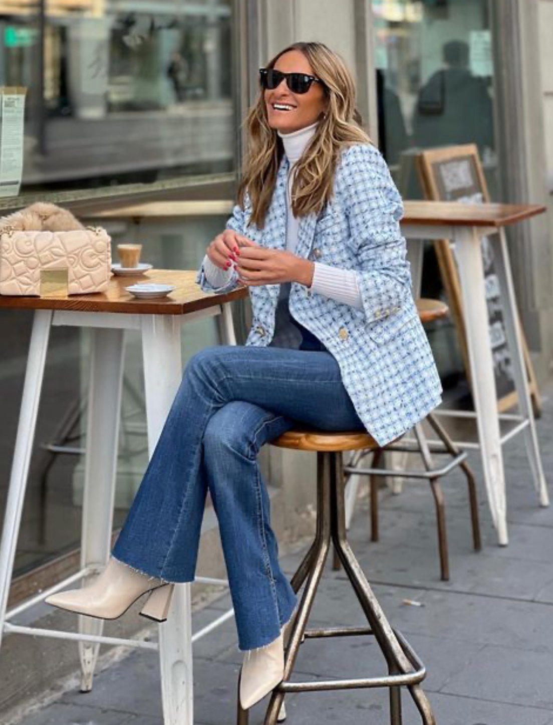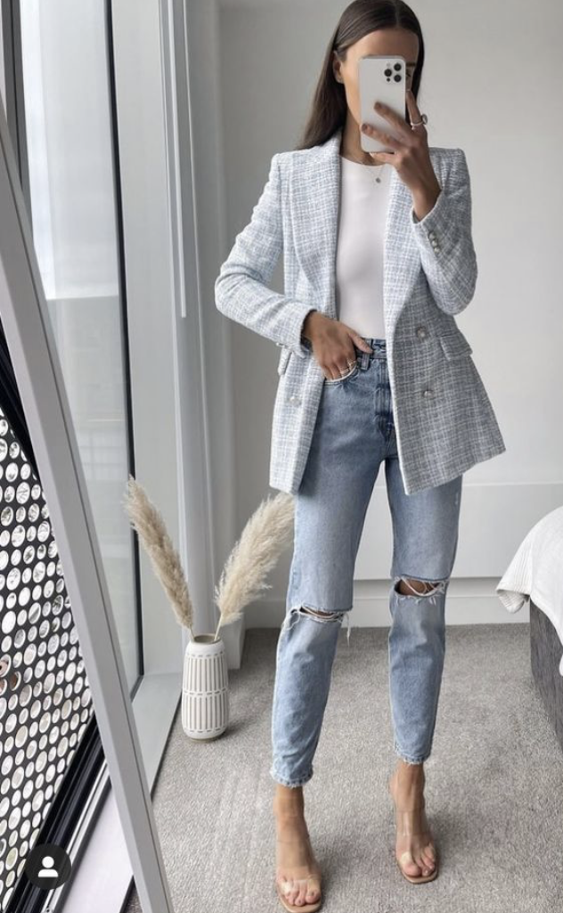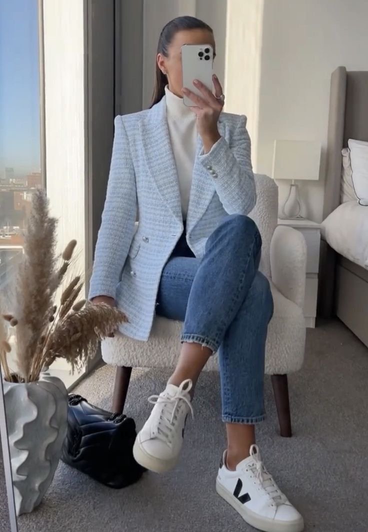 Синьото сако си е класическа кройка , изобщо няма как да му мине модата. Аз бих го съчетала с панталони и изчистени топ-ове в екрю , бежово. С дънките трябва да се уцели точния цвят иначе се оплесква визията .