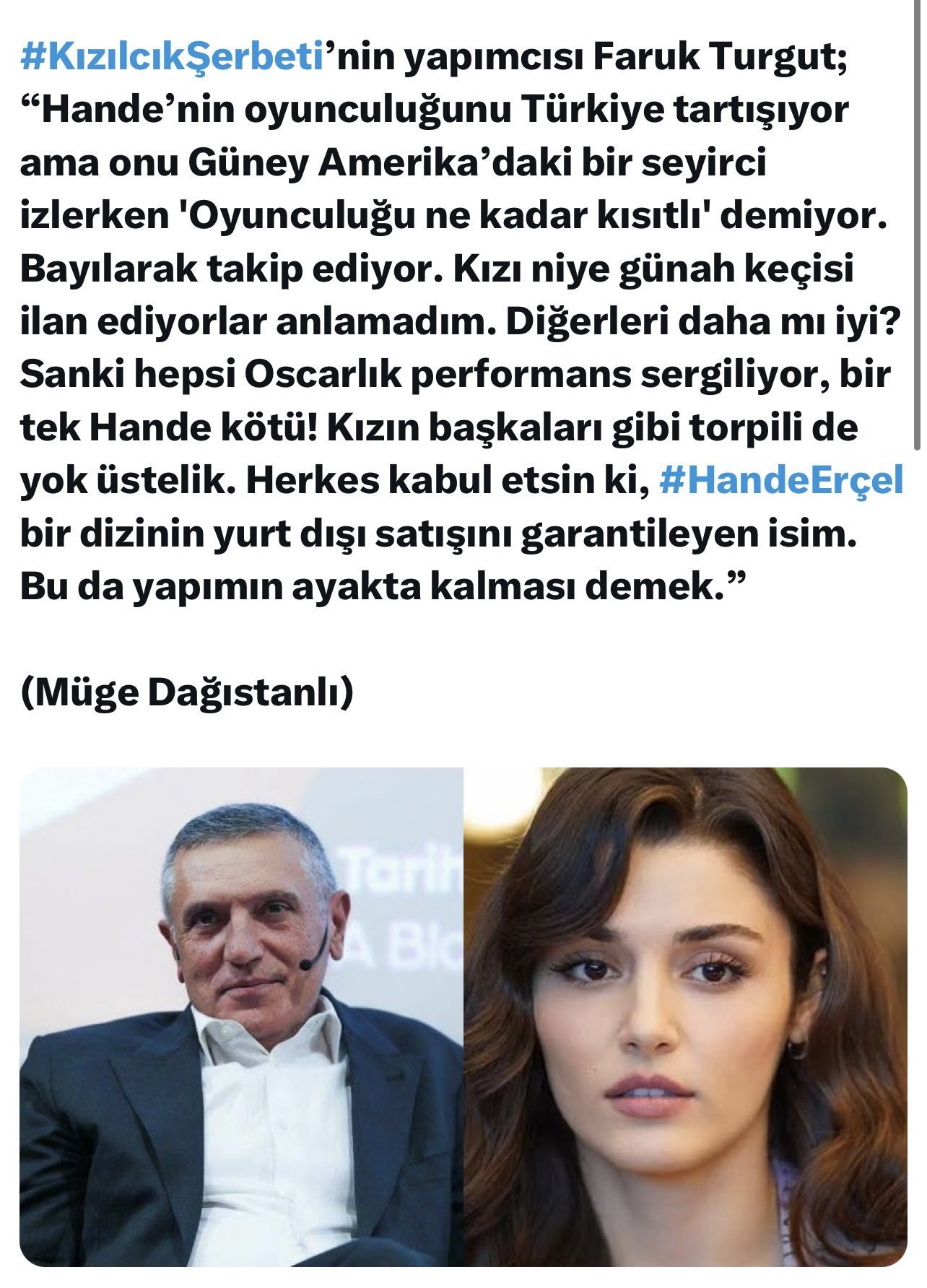 Тургут, собственик на продуцентската компания Gold Film: В Турция има противоречия относно играта на Ханде, но когато публиката я гледа в Южна Америка, те не казват: „Нейните актьорски възможности са ограничени“, а по-скоро я следват с пълно очарование. Не разбирам защо правят момичето актриса изкупителна жертва. Останалите по-добри ли са от тях? Сякаш всички играят достойно за Оскар и само Ханде е лоша и на всичкото отгоре Ханде няма никаква подлост като другите. Всеки трябва да приеме, че Ханде Ерчел е име, което гарантира чуждестранни продажби на сериала, а това означава, че продукцията ще бъде стабилна.