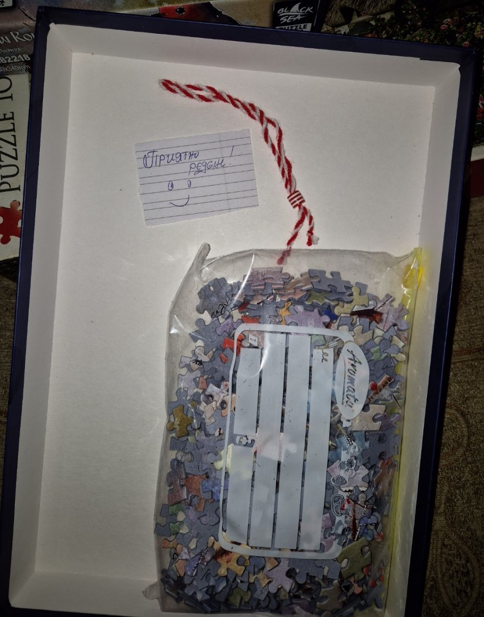 Поръчах си  пъзел от една жена. Получавам днес пратката, а в нея ми е изпратен още един пъзел подарък и мартеничка с мила бележка.