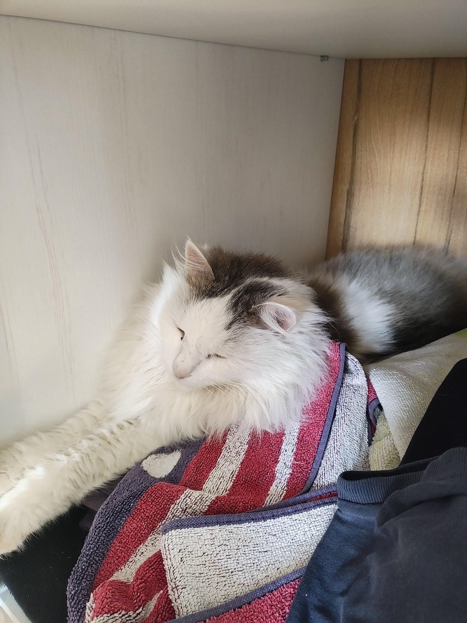 Памук цял ден спи на този рафт в гардероба и разбира се е смачкал всичко.