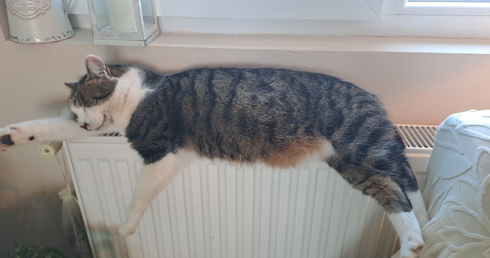 Вчера беше ужасно смешен. Беше заспал на радиатора в тази поза и в един момент насън падна.