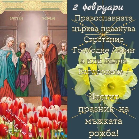 Днес 2-ри февруари е Сретение Господне , който се почита от дълбока древност. Чества се за първи път в Йерусалим и винаги е на четиридесетия ден от Рождество Христово. Тогава малкият Иисус е заведен за първи път в Храма.   Ето защо това евангелско събитие се нарича Сретение (среща/.