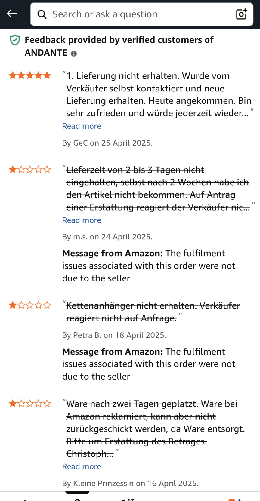 Интересни са и коментарите към продавача. Оплаквания за доставка, които са задраскани и отговор отдолу от Амазон