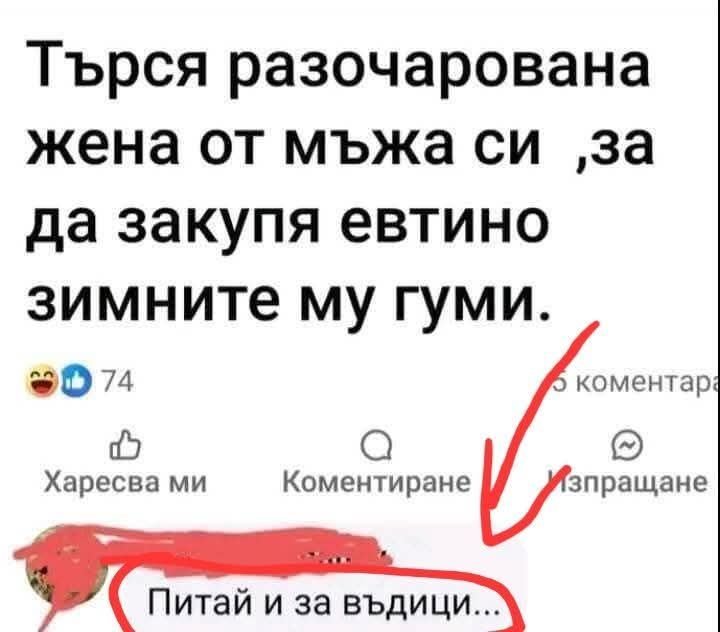 Свалям ги - облечени, пак ги слагам - голи! Не питам за цена, взимам ги, бегом на улица и повтарям теста. Слагам ги – всички голи! Свалям ги - облечени! Бързо се прибирам вкъщи с очилата, за да се изфукам пред жената. Влизам - жената и комшията голи! Свалям ги - голи!  Кога успяха да се развалят!!!