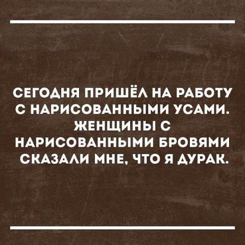 Днес дойдох на работа с нарисувани мустаци. Жените с нарисувани вежди ми казаха, че съм идиот.