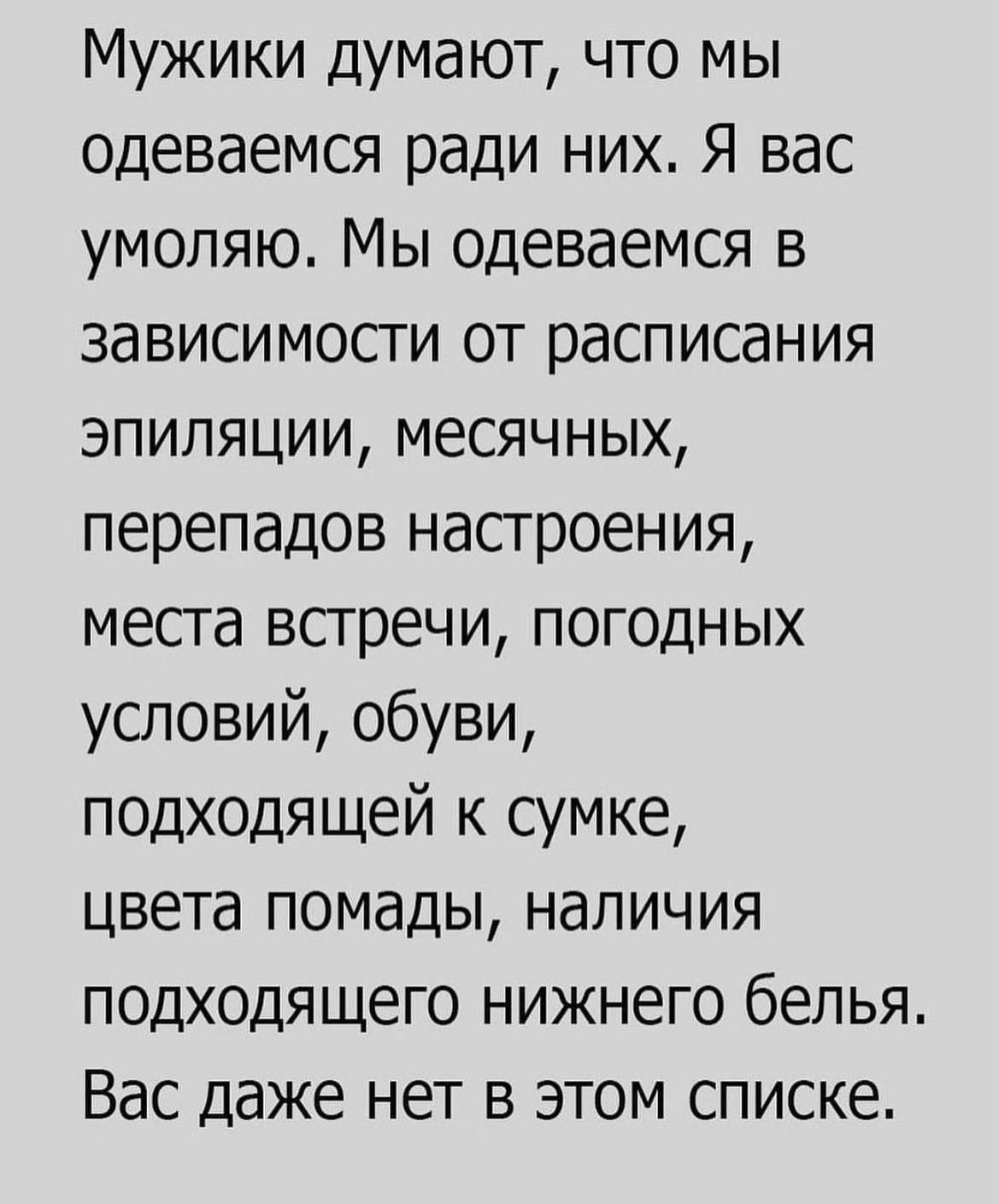 Мъжете си мислят, че ние се обличаме за тях. Моля ви се. Ние се обличаме в зависимост от графика за епилация, месечния цикъл, промените в настроението, мястото на срещата, метеорологичните условия, обувките, подходящи за чантата, цвета на червилото, наличието на подходящо бельо. Мъжете дори не са в списъка.