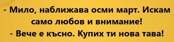 Мъже! Бъдете смели! Изненадайте жените си за 8-ми Март, като се приберете на 9-ти сутринта.
