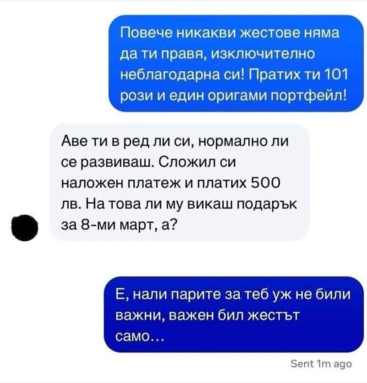 - Сто пъти ти напомних да не ми купуваш нищо за 8-ми март и пак си забравил да ми вземеш подарък!