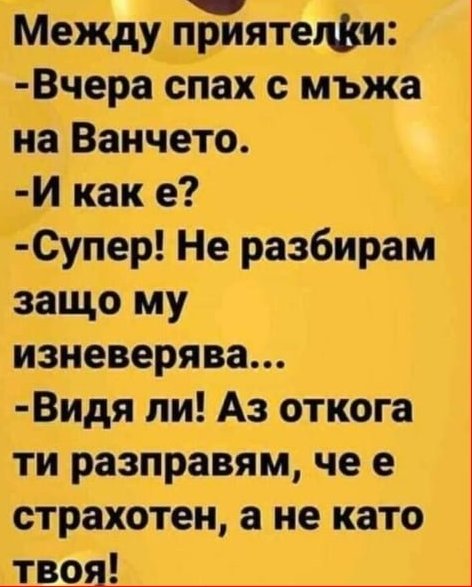 - Вчера ти купих супер удобни обувки за 150 лева. С 15 сантиметрови токчета, които въобще не ти пречат. Така че, прибирай се пеша...