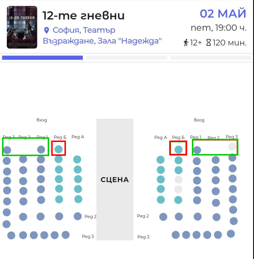 pileto, залата на Театър Възраждане е много малка, специално за 12 гневни сцената е разположена по средата, напречно, а публиката е разделена от двете ѝ страни. Редовете А и Б са първите два реда, точно както ги виждате на схемата. Вземете си за първи ред (А), щом имате такъв избор. Не мисля, че има значение от коя страна на сцената - актьорите са в движение, сменят си местата. Единствено Христо Мутафчиев е по-статичен (разбираемо) и когато аз гледах, седеше на стол от ляво на сцената (на схемата за закукпуване на билети - в ляво).