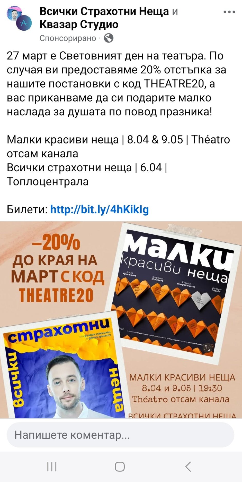 Честит световен ден на театъра! С пожелание да попадаме само на хубави и качествени постановки. 😃
