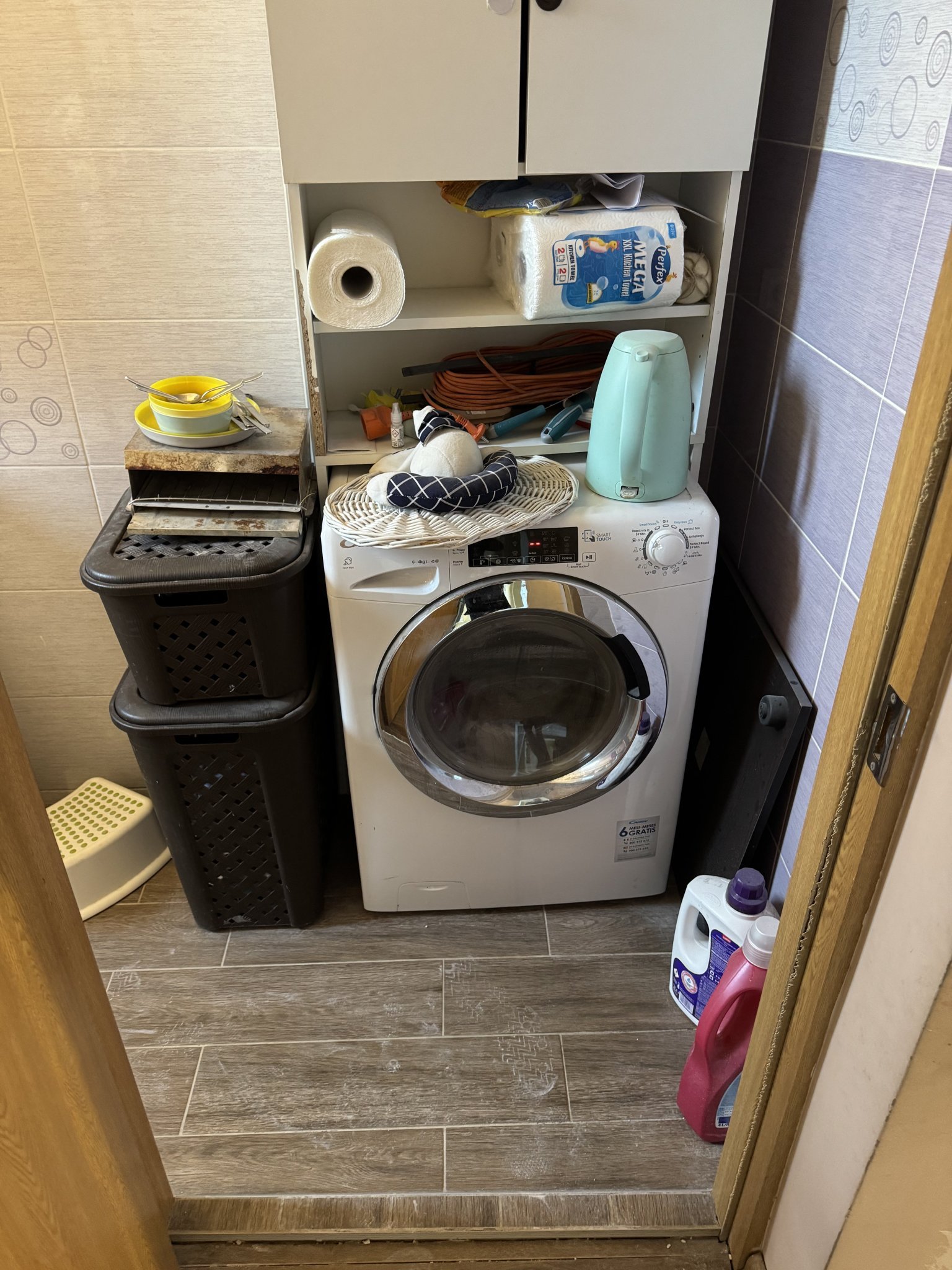 Аз бих се отървала от шкафа и бих сложила два отделни уреда един върху друг. Така пералнята ще е с по-голям барабан и сушилнята ще събира повече пране