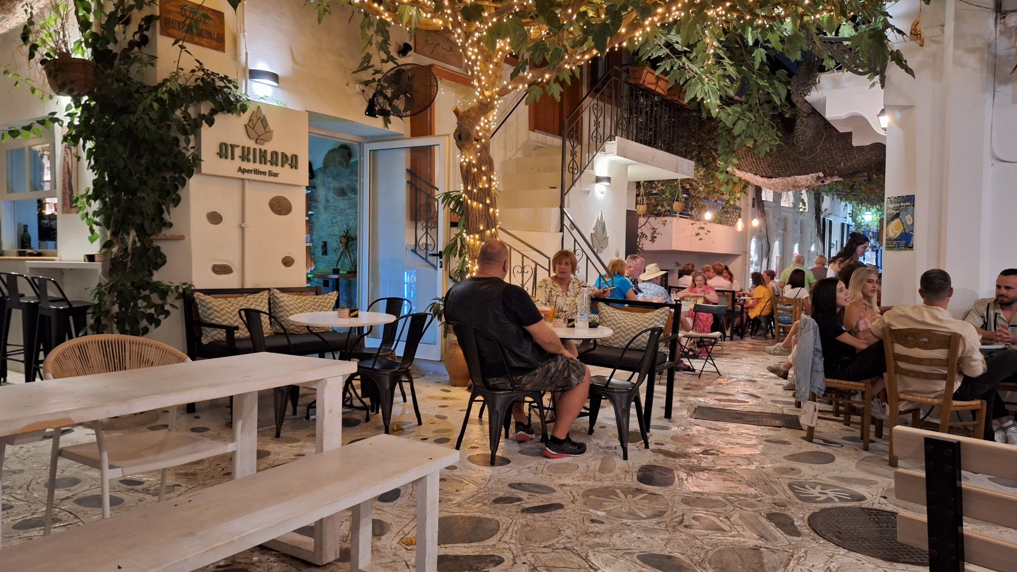 Обаче нас ни зове таверна Μαϊστράλι малко по-натам. Пък и пред нея според картата има малък плаж. Таверната е чудесна, има две-три маси клиенти, хапваме от местния артишок и сме предоволно отпуснати, когато в края на обяда стоварват цял автобус с баби-поклоннички. Какофония!