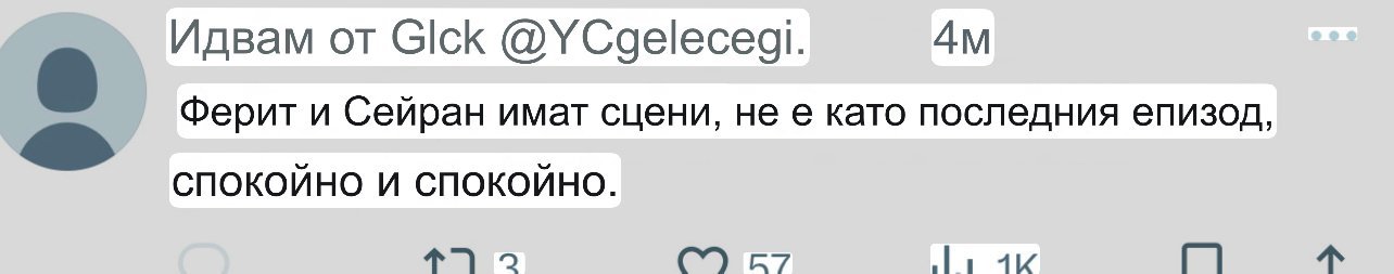 Чета сега разни коментари,че изненадата може да е Абидин да застане пред Ферит да го предпази/дали ще умре или оцелее не се знае/ и летящите куршуми ще ранят Сейран.Та във връзка с тези коментари: този,който извърши грях иска да умре ,за да се пречисти ,а тези, спрямо които е извършен ще платят за него.Сабър,я!