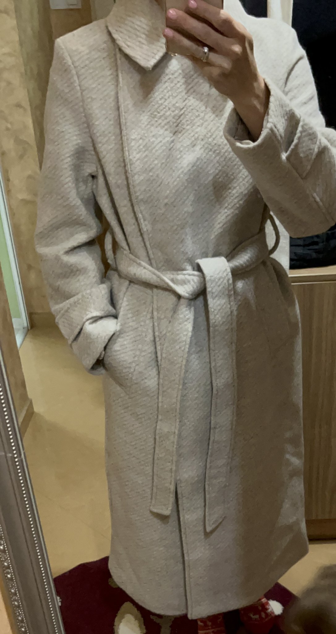 Кройката му е такава на палтото, при мен също стои набрано с колана, ръкавите имат свобода. Няма нищо общо с с коментираните други  палта и цветове в една серия