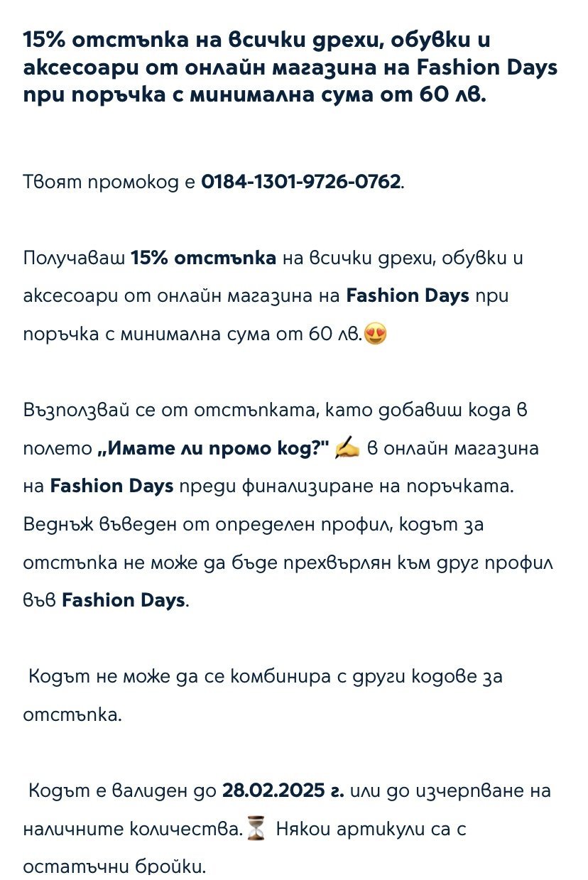 Здравейте Simple Smile Дали има код за Модиво - не откривам валиден назад. Благодаря и разкошен ден!