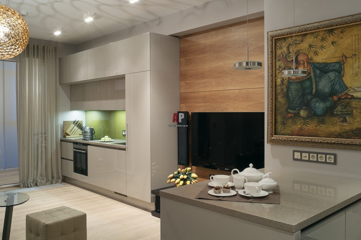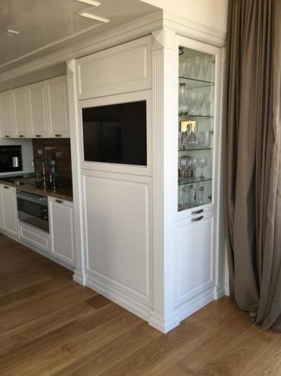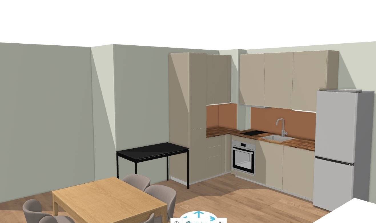 Към въпроса ми за ТВ до кухненските шкафове - за вертикален разделител може да стане колона, по-тесничка, с механизми за изтегляне. Прилагам две примитивни визуализации, като нито цветовете са тези, нито детайлите са ОК (ама това позволява програмата). Питам пак за мнения, кой вариант ви харесва повече Simple Smile
