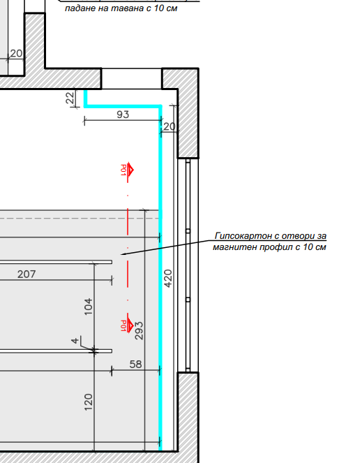 Таванът е 290, с падането 280. Но там където е бяло на чертежа, няма гипсокартон (само сивото е гипсокартон).