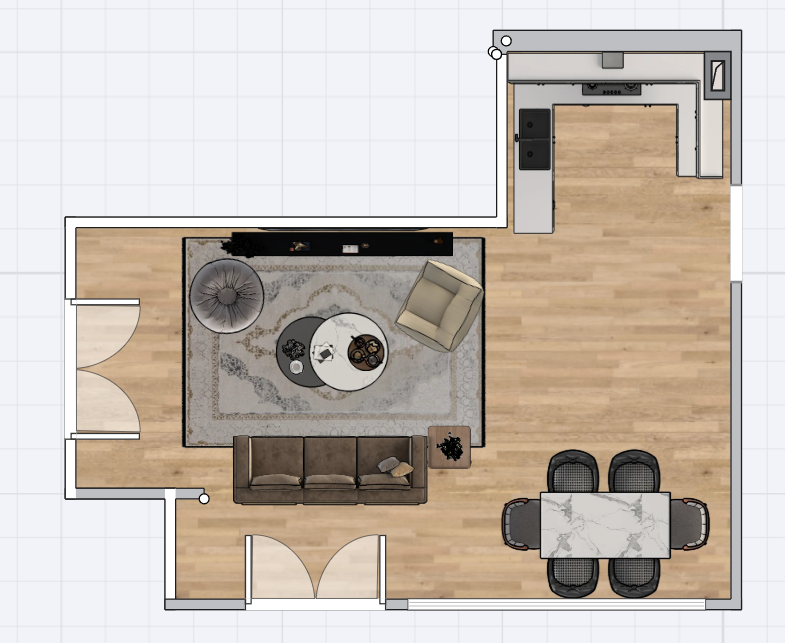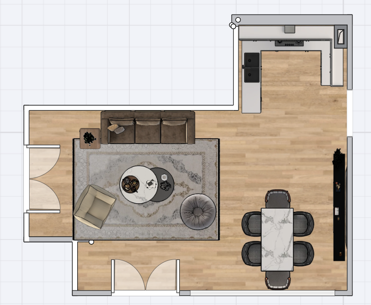 Кухнята предвиждам да е на мястото на дивана към вратата на малката тераса. Масата за хранене точно пред нея към вратата на голямата тераса.