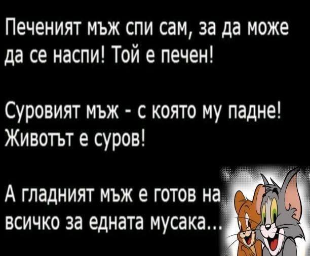 Та ето (една възможна) мъжка гледна точка в отношенията: - Мъжете сме прости хора - изпитваме само две чувства. Ако ни видите без ерекция, направете ни сандвич.