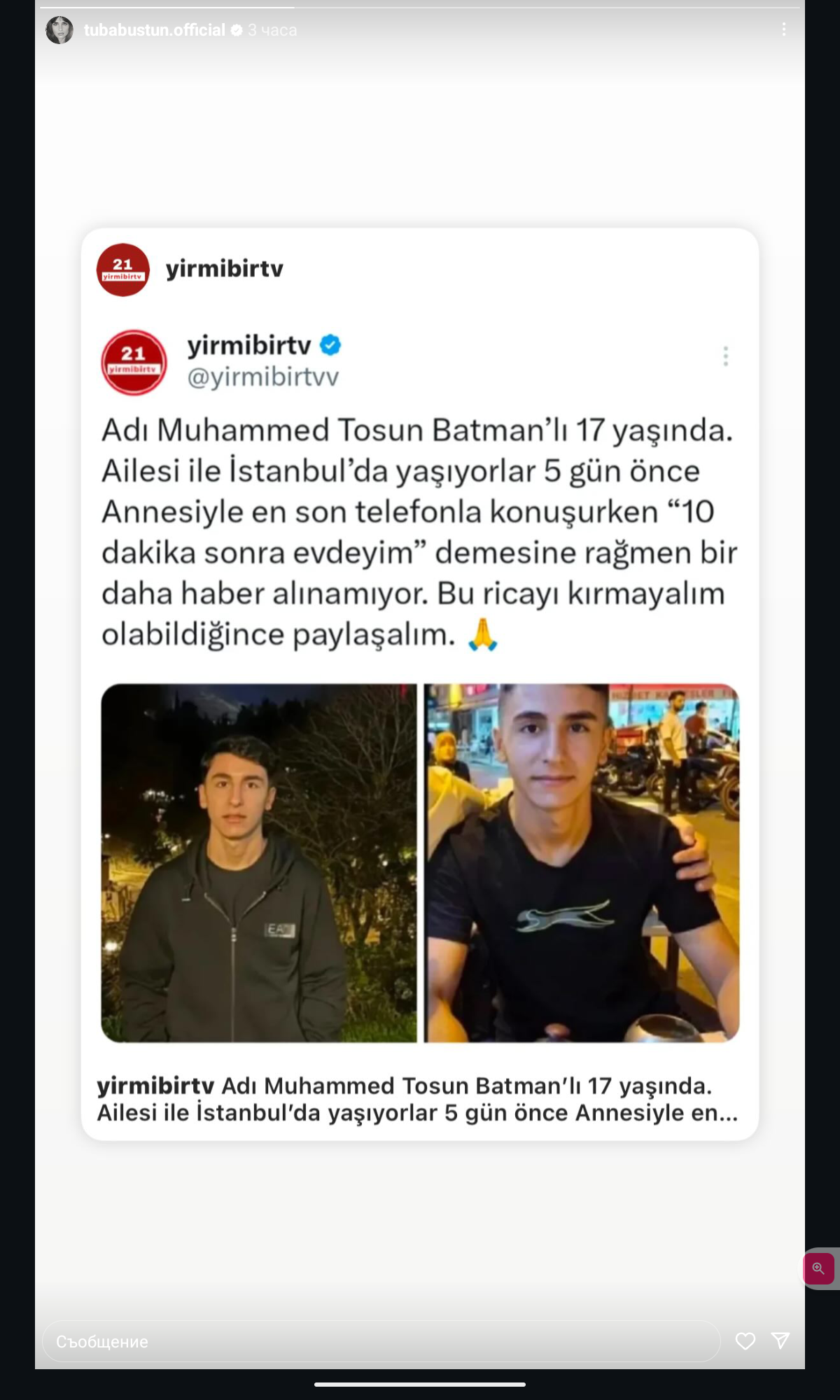 Туба днес е споделила инфо за изчезнал младеж.