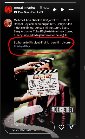 Снимките на Dread Bey приключиха днес. Безкрайно съм благодарен на моя невероятен екип, който работи много здраво. Благодаря на всички мои приятели актьори, особено на Баръш Ардуч и Туба Бююкюстюн.