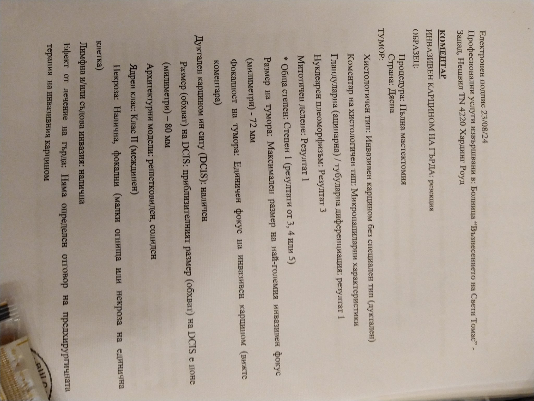 Alatea, няма да се подложа на операция преди комисията. Онкологът беше д-р Мила Петрова от Надежда. Тя каза, че съм за операция и че по-бързо ще стане с комисията, ако хирургът ме представи. От контрастната мамография туморът е определен на 10 мм. От ИХХ -Хормонално зависим, HER2 отрицателен и Ki67 5%