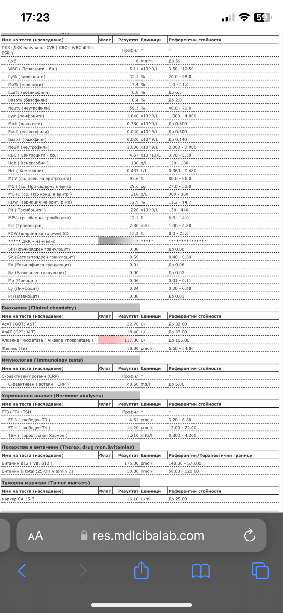 Момичета, излязоха резултатите ми. Алкалната фосфатаза ми е над нормата и витамините Б12 и Д са ми на долна граница според мен. Качвам ги тук, моля, ако някой има желание да ми ги разчете!