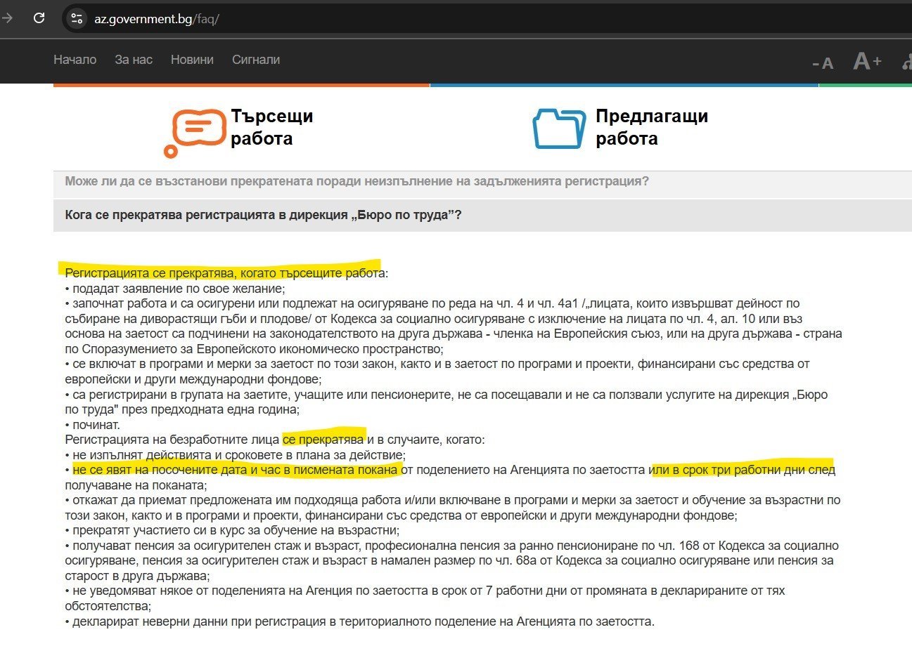 Текстът цитиран от мен и наличен в сайта на Агенцията се оказа от Закон за насърчаване на заетостта, по-точно чл  20, актуална версия, достъпен в Lex.bg. Следва да е по-достоверно и човек да може да се опре на него. Та прекратяването на регистрация за 1 ден закъснение, без ибяснение и предупреждение, звучи неправомерно.