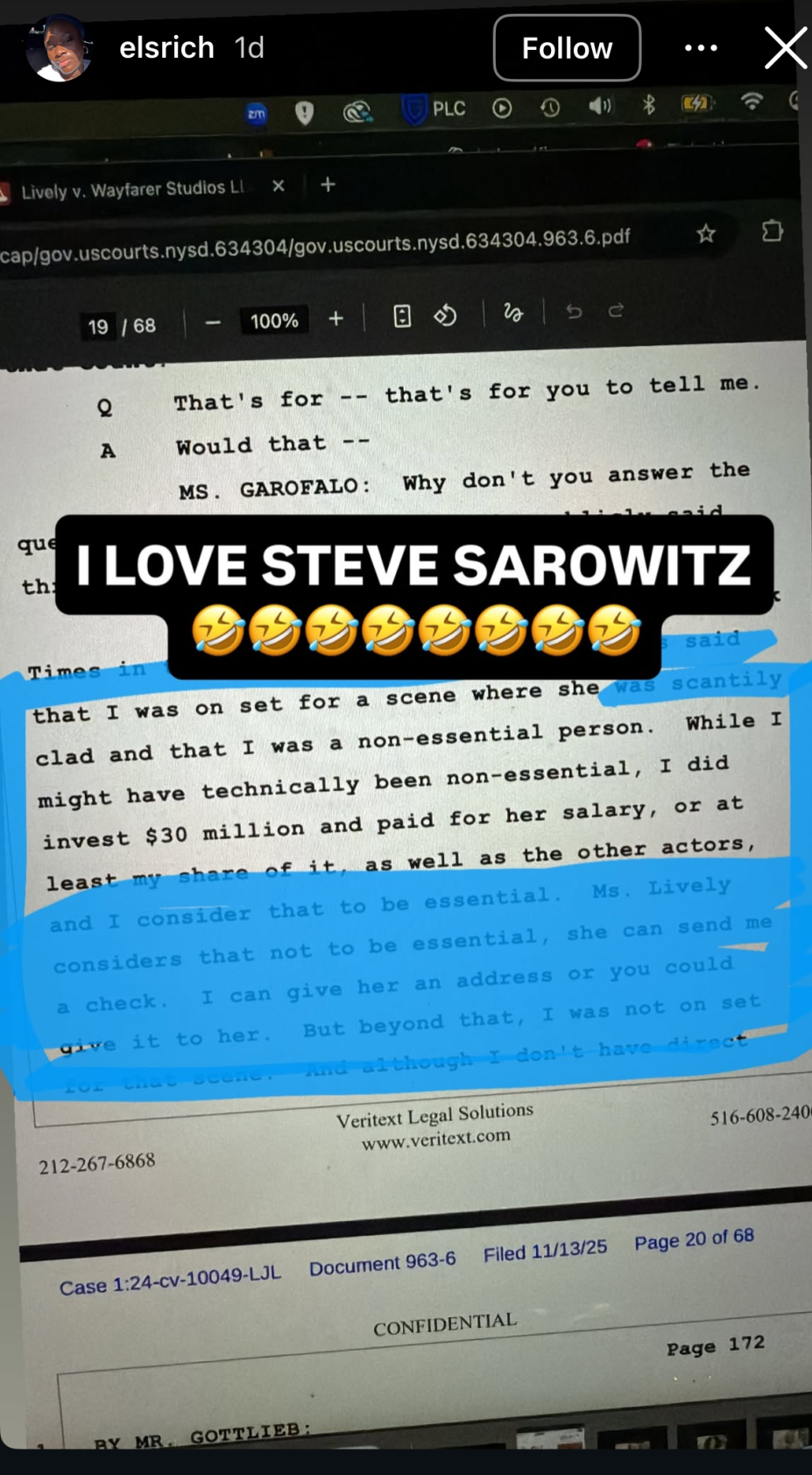 Нещо любопитно, което вчера се разнася в нета. Някой припомни, че адвокатите на Балдони и Блейк общо са внесли в съда споразумение, че са се разбрали всеки да подаде до макс еди-колко-си страници за Motion for summary judgement и взаимно са се съгласили да си удължат срока за отговор. Целта е била, предвид задаващите се два големи документа, да си облекчат взаимно работата. Да, обаче само адвокатите на Балдони внасят такова. Сега се коментира дали не е било поредната неетична постъпка на адвокатите на Лайвли, които не са имали намерение да подават такъв документ, но през цялото време са се престрували, че ще има, за да ограничат страниците на документа на Балдони и да си увеличат техния срок за отговор.