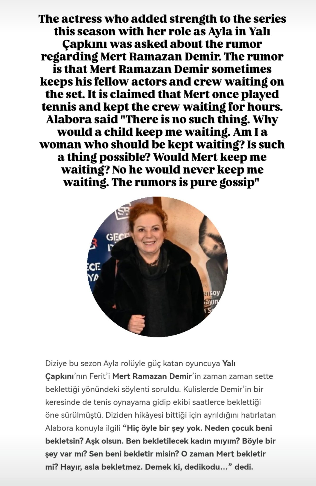Жълтурките мръсни искат взаимодействие и го получават като в глупавите си репортажи спомеват Рамо. Актрисата, която питаха за него много хубаво им отговори: “Всички на снимачната площадка ще кажат, че Мерт е много забавно и уважително дете” и това за закъсненията е лъжа!