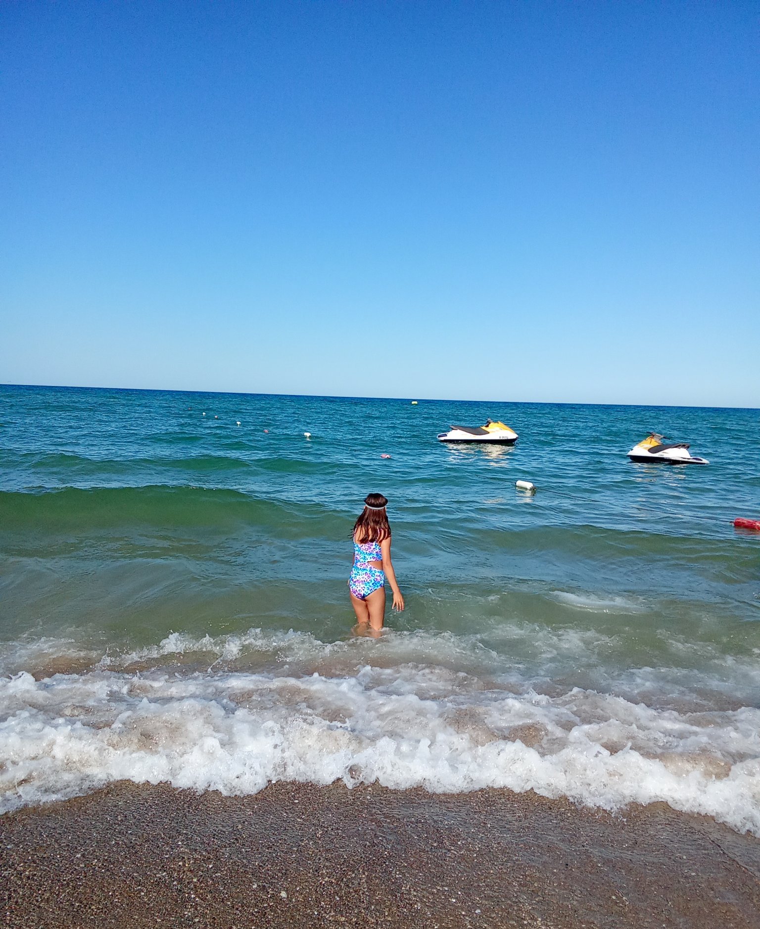 Водата е топла, има малко вълнение, но нищо страшно, флагът е зелен. Открихме и още едно приятно заведение до брега - "Морски звуци".