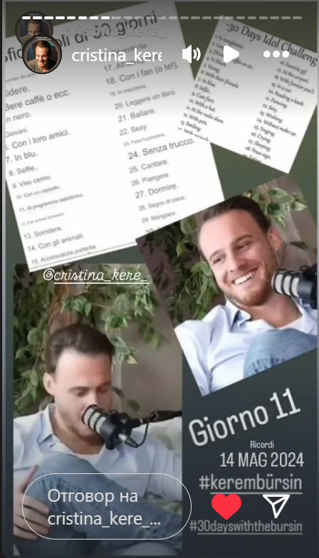 Преди 1 година Керем сподели в историята си снимка с Осман Кая и плаката на Синята пещера с посланието "не спираме да мечтаем" създала история, която ни плени месеци по-късно написана от двамата, в следните слайдове си спомняме приятелството, което обединява Керем и Осман, обединен от професионални проекти като Underarmour, Aynen Aynen и както каза Керем в последните интервюта, ще продължи да работи за сближаване на повече проекти между тях Bi tuhaf Hikaye 🇪🇦🇹🇷