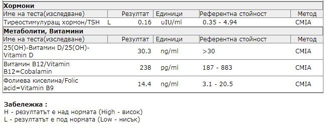 Момичета, тези резултати как ви се струват? TSH преди 6 месеца ми беше 3.3, но тогава го изследвах на 2 ден от МЦ, заедно с хормони. Сега не съм приемала нищо, пък е паднало до 0.16. След седмица ще коментираме с лекарката. Много ли е ниско?