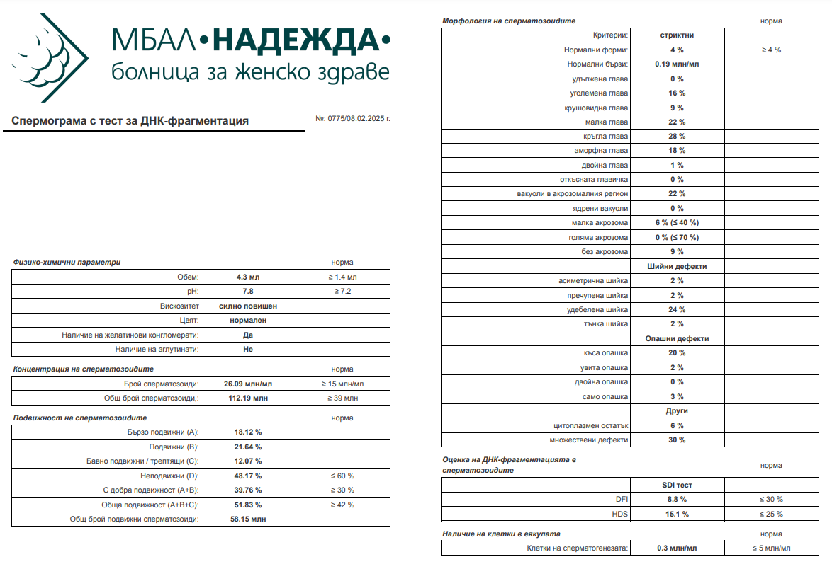 По повод на лечебните заведения - досега никога не съм се впечатлявала от база и т.н. Родих в Шейново заради д-ра, за ужас на ММ, който не иска повече да стъпи там. А миналата година пък беше А в местния МБАЛ. Абе, с две думи - следвам си лекарите. Обаче, откакто се наложи да видя отблизо календара с пожарникарите, да видя как като бял човек се регистрираш, всичките ти изследвания стоят на едно място, всичко е бързо, електронно и прегледно. Плюс сума добри отзиви за болницата и докторите там - няма как да не се впечатля от Надежда и съвсем реално започвам да се замислям при потенциално забременяване да се преселя за 9м в София. Sweat Smile По този повод - силно съм впечатлена от резултатите от СГ - излязоха за отрицателно време. Слагам ги в скрит текст. По мое скромно мнение /доколкото съм чела/ всичко изглежда наред. Заключението също е нормозооспермия, но все пак двойките с повече опит нека кажат - има ли някой индекс дето не е както трябва? Някой процент дето е по-висок отколкото трябва да е? Питам, за да знам дали да юркам ММ за добавки разни. Grinning