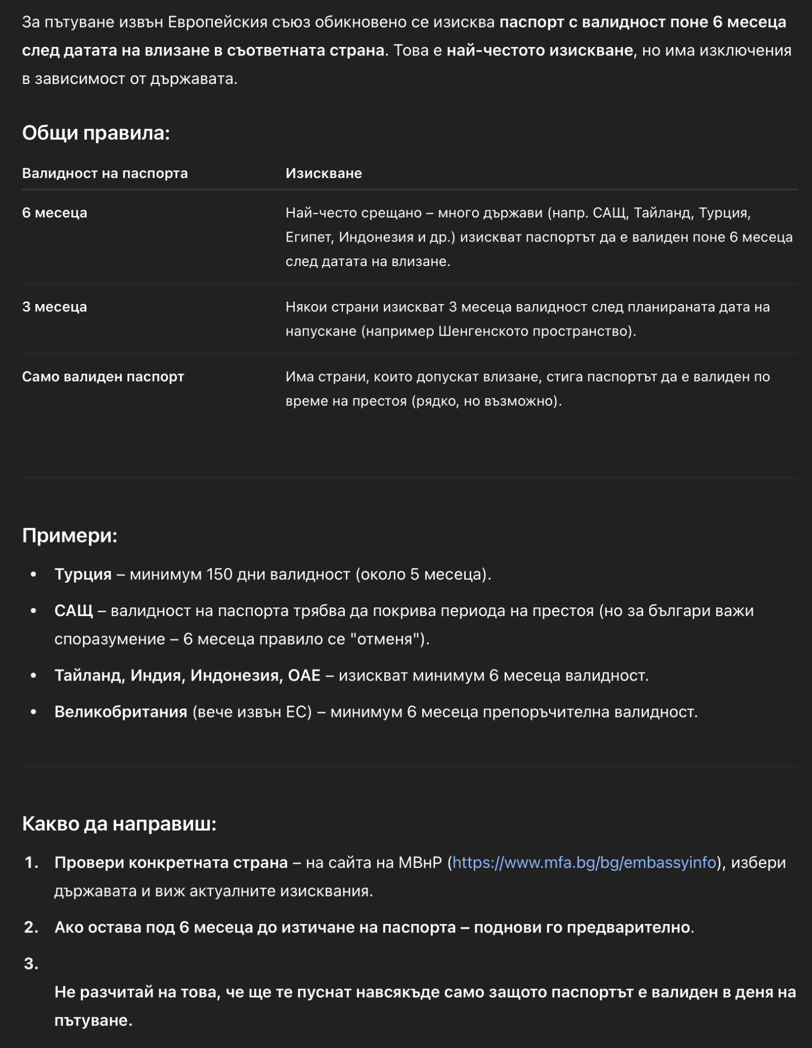 Много зависи с какъв транспорт се пътува. Когато сте със самолет самите авиокомпании изискват валидността на документа да е поне 6 месеца, независимо какво пише Министерството на външните работи. Нека и това се отбележи!