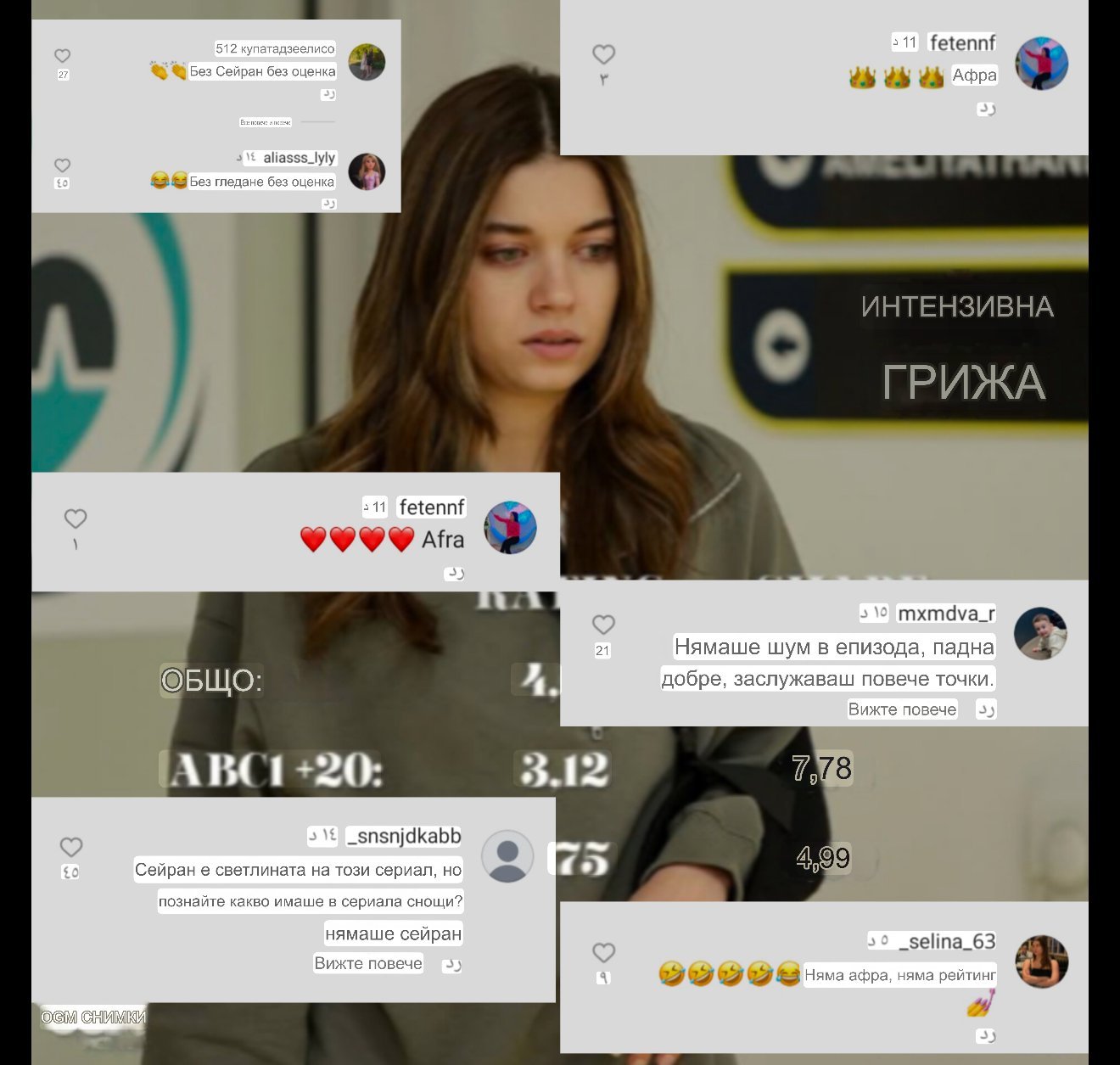 Ако са верни твърденията на хора ,попаднали на сетовете,че Афи е изглеждала разстроена,сега си обяснявам защо.Да ти е поверена главна роля,да се скъсаш от работа повече от две години,да изградиш образ,който те изтреля на върха и феновете обикнаха ,да се опитват упорито да те изместят от тази главна роля и накрая екранното ти време да е сведено до това на треторазрядна актриса ,как да не си разстроен.Явно и 93 ще я гледаме 10 мин.